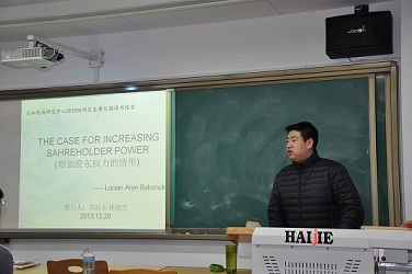 本次报告会的文章是《增加股东权利的情形》(THE CASE FOR INCREASING SHAREHOLDER POWER),其作者是哈佛大学法学院的BEBCHUCK教授。2013级硕士刘欣东首先介绍了文章的内容介绍和第一部分。随后,2013级硕士林蔚然对文章的其他内容做了详细介绍,其中涉及到文中作者对于增加股东权利的益处的论证,以及作者的制度设计,并对于传统上对于股东中心主义质疑的观点进行了回应。