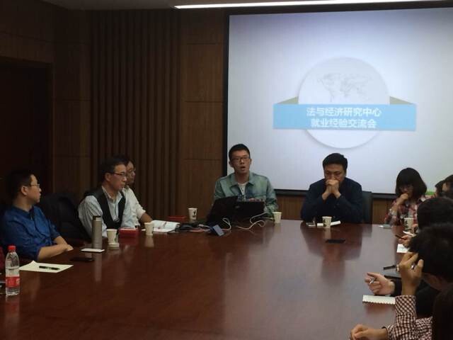 2014年10月18日,法和经济学研究中心在学院路校区举行2012届毕业生就业经验交流会。交流会由席涛教授主持,邀请了2012届的张芳雪、高雪男、丁峰、胡健毓4位毕业生,中心李文静老师、法律与经济专业三年级研究生以及二年级、一年级硕士研究生参加了此次交流会。