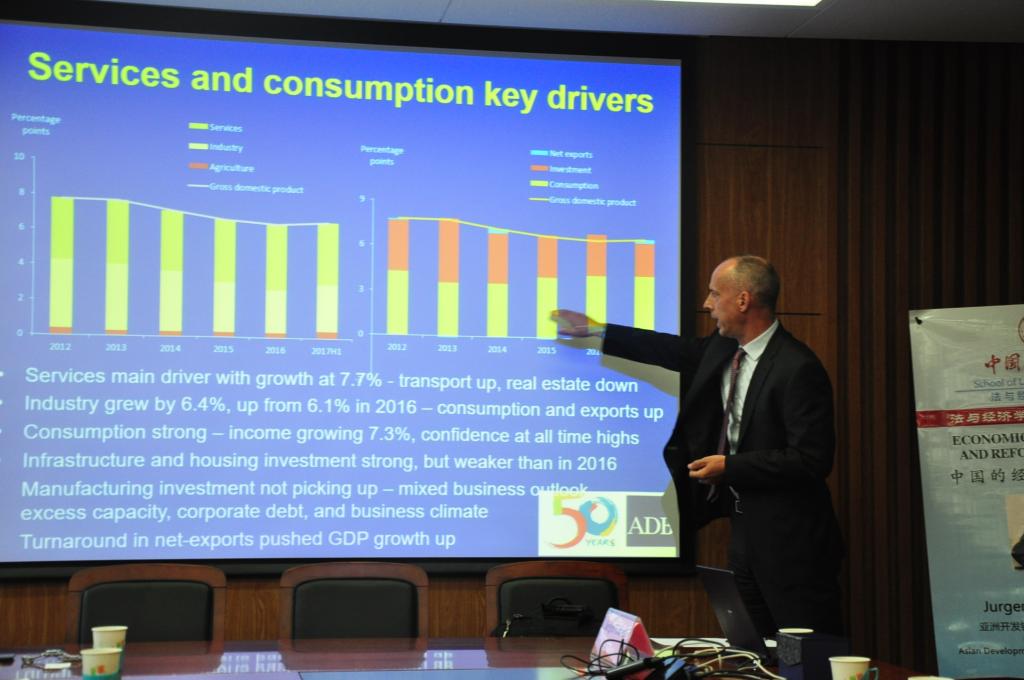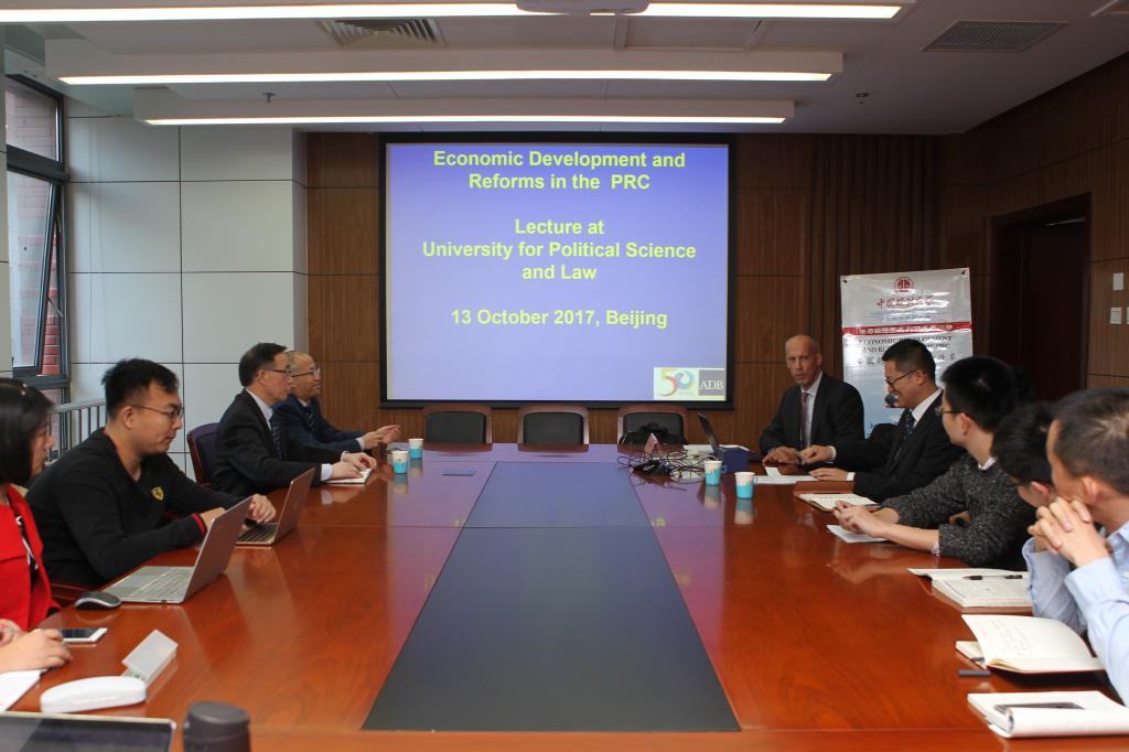 2017年10月13日,亚洲开发银行(Asian Development Bank)驻中国办事处经济部部长Jurgen Conrad先生在中国政法大学学院路校区为365APP下载的师生作了题为“Economic Development and Reforms in the PRC”的学术讲座。讲座由365APP下载徐光东教授主持,李文静讲师和徐文鸣讲师点评。365APP下载院长席涛教授参加了讲座。