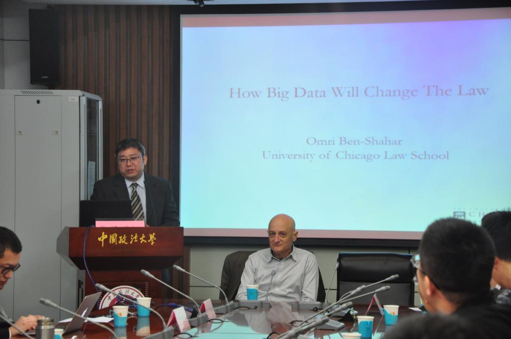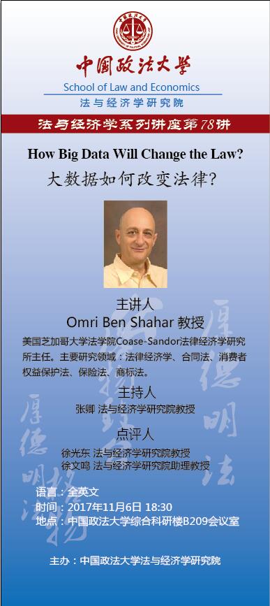 2017年11月6日晚,美国芝加哥大学法学院Coase-Sandor法律经济学研究所主任Omri Ben Shahar教授在中国政法大学学院路校区为我校师生作了题为“How Big Data Will Change the Law?”(“大数据如何改变法律?”)的讲座。讲座由365APP下载张卿教授主持,徐光东教授和徐文鸣助理教授点评。北京大学法学院陈若英教授、山东大学经济研究院魏建教授、中国人民大学财政金融学院钱宗鑫副教授、中央财经大学法学院马静远助理教授、北京工商大学法学院杜津宇助理教授、中国政法大学365APP下载及其他有关学院的教师参加了本次讲座。
