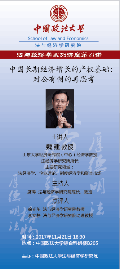 魏建教授最后介绍了有关产权和经济增长的理论和国际比较。魏建教授从解释行为经济学出发,列举生动的实例,谈及了美国、印度、拉美和墨西哥的土地产权政策,同时横向比较了各国在产权和经济发展中的不同政策经验。魏建教授还提出了两个值得思考的问题:一是产权保护和产权使用哪个更重要;二是,由于在公有产权框架下,资源利用效率不能实现最大化,那么公有制在中国经济增长中还能发挥哪些作用。魏建教授认为,中国的公有制为资源重新配置提供了良好的制度和信任基础。